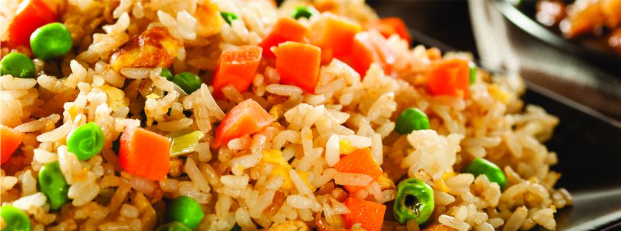 Pekingsuppe, gebackene Ente mit Gemüse in scharfer Sauce, gebratenes Rindfleisch mit Zwiebeln, Paprika, Porree, gebackenes Hühnerfleisch im Teig mit süß-saurer Sauce, dazu gebackene Bananen.