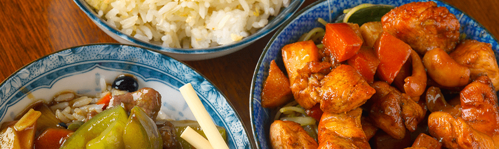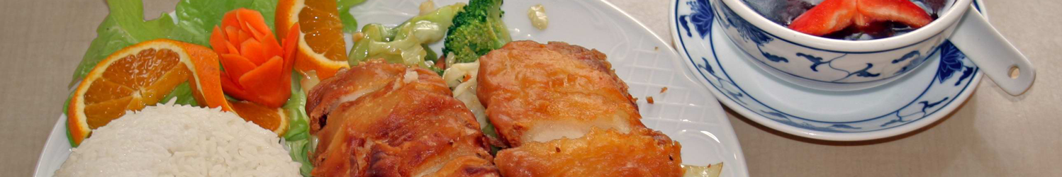 Pekingsuppe, gebackene Ente mit Gemüse in scharfer Sauce, gebratenes Rindfleisch mit Zwiebeln, Paprika, Porree, gebackenes Hühnerfleisch im Teig mit süß-saurer Sauce, dazu gebackene Bananen.