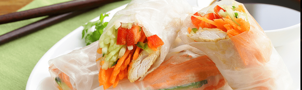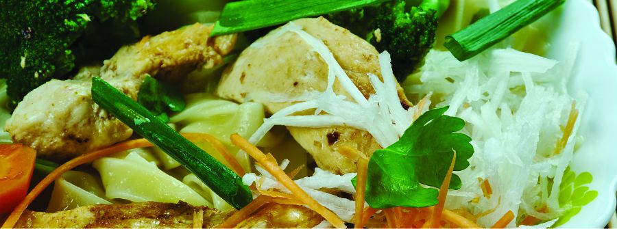 mit Ei, Sojasprossen, knusprig gebackene Hühnerbrust, dazu Sauce nach Wahl